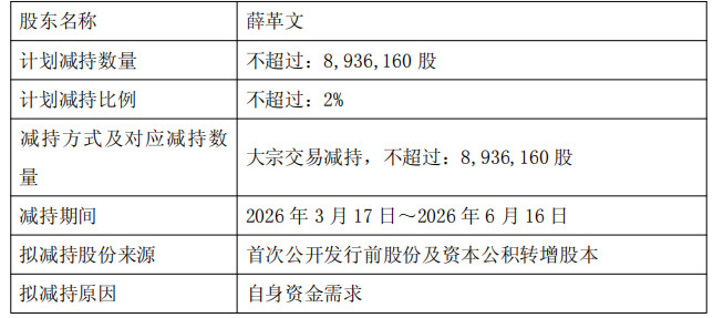 公司控股鼓舞薛革文策动在公告之日起15个来过去后的3个月内(即2026年3月17日至2026年6月16日)通过巨额来往阵势减合手公司股份不特出8,936,160股(即不特出公司总股本的2%)。