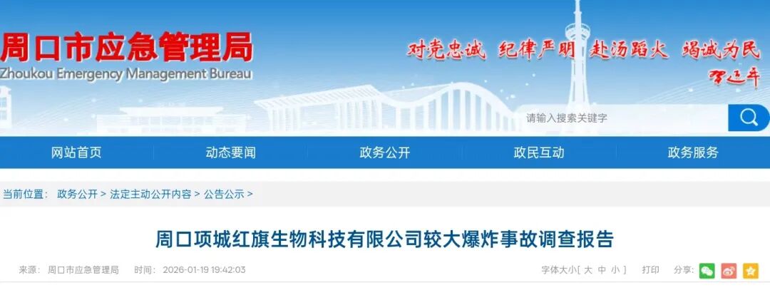 1月19日,周口市应急管理局公布了《周口项城红旗生物科技有限公司较大爆炸事故调查报告》。