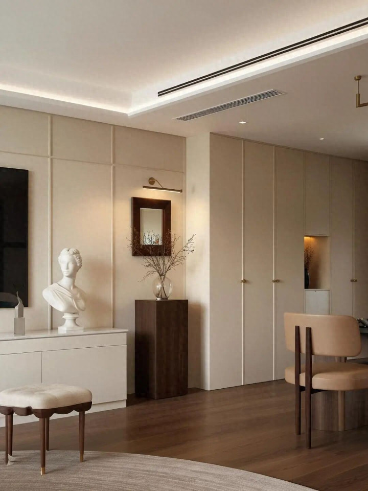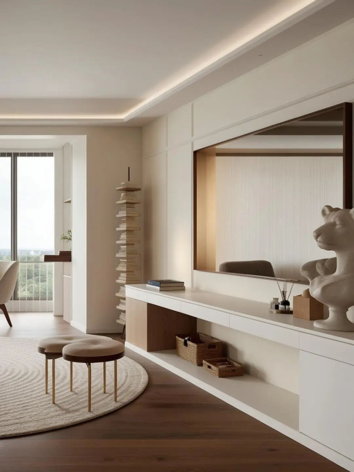 本日共享:玄关收纳王者墙+诊治感径直拉满的客厅~浅棕弧形沙发+大理石茶几!