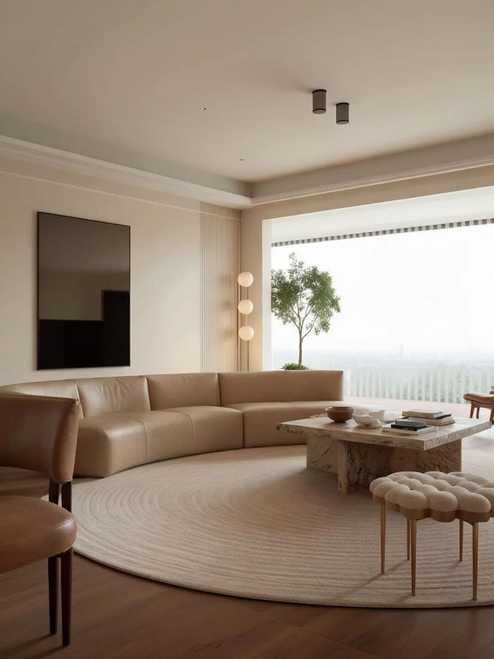 这才是信得过瞎想中的慵懒旯旮!是不是一进门就被这个弧形沙发和缓住了, 浅棕色弧形沙发 线条显露,搭配同色系单东谈主椅,围合出超有安全感的聊天区~和缓又诊治啊!!