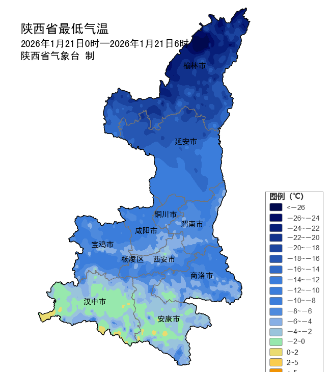 今晨(截至06时)全省大部气温较昨晨继续下降,陕北、关中和陕南大部107个区县2832监测站最低气温低于0℃,具体分布:陕北-31.2~-8.0℃,下降-4.5~4.7℃,降幅最大横山区陈圪堵站-4.5℃;关中-13.9~-1.7℃,下降-4.8~5.1℃,降幅最大岐山县岐山故郡涝川站-4.8℃;西安站-2.8℃,降幅最大0.1℃;陕南-13.1~1.4℃,下降-4.8~1.1℃,降幅最大镇安大坪镇站-4.8℃。