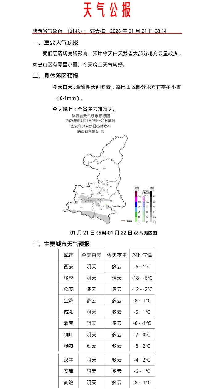 25日: 全省阴天,陕北部分地区有分散性小雪,关中南部、陕南有小雪或雨夹雪。日平均气温全省大部下降2~4℃、局地下降4~6℃。
