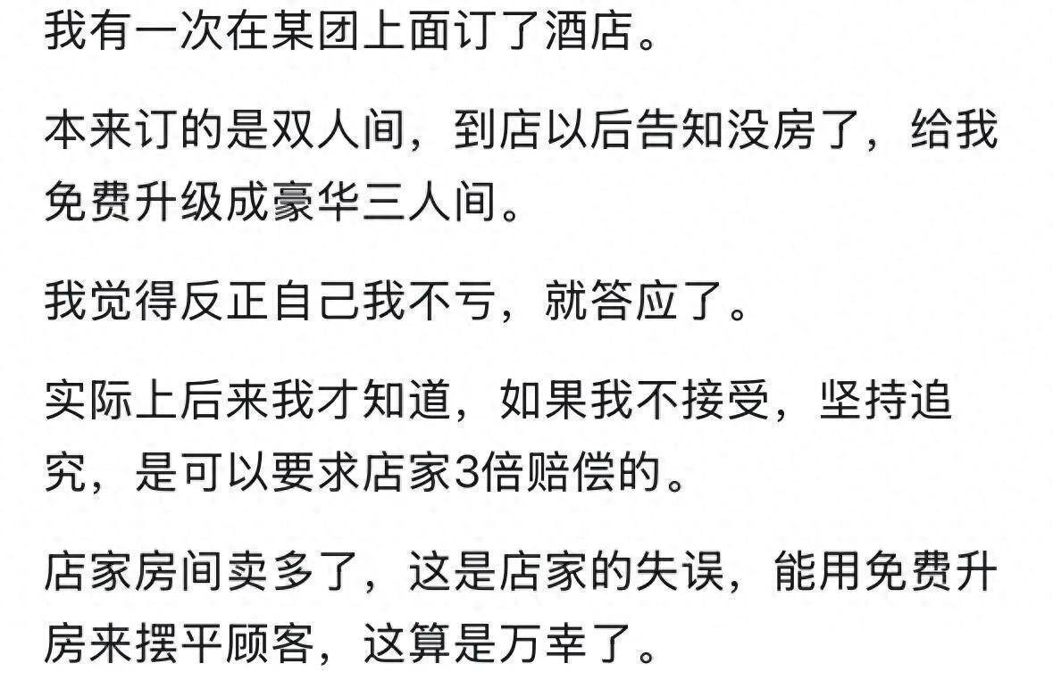 三倍那是一间房都没了才会赔你,东谈主家给你升级,你不领受那最多原价退款,思赔钱是不行能的。