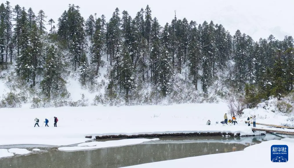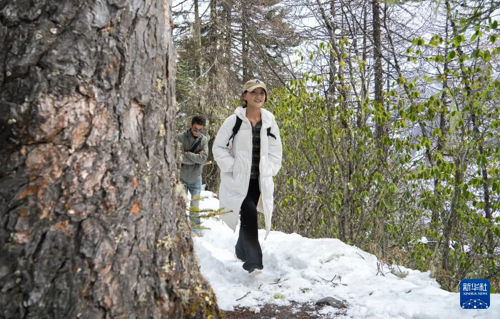 游东说念主在白普隆沟牧场感受雪景(3月21日摄,无东说念主机相片)。