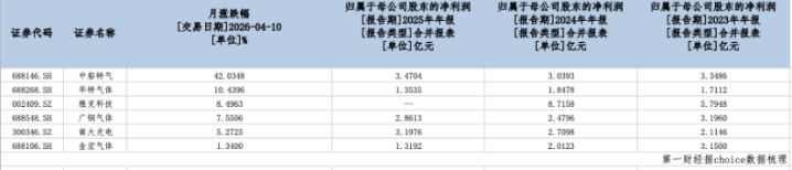 中船特气2025年归母净利润为3.47亿元,较2024年的3.03亿元显赫增长;南大光电归母净利润为3.19亿元,2024年同时为2.71亿元;广钢气体归母净利润为2.86亿元,较2024年的2.48亿元亦有赫然进步。然则,后两者近一个月的股价涨幅赫然弱于华特气体。Choice数据显露,南大光电、广钢气体近一个月涨幅鉴识仅为7.55%和5.27%。