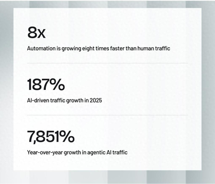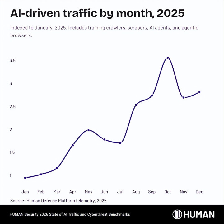 聚集安全公司 HUMAN Security 在 3 月 26 日发布了《2026 年 AI 流量与聚集要挟基准评释》,基于其注意平台在 2025 年处理的朝上一千万亿次(quadrillion)交互数据,给出了一组惊东说念主的数字:2025 年,互联网上的自动化流量同比增长了 23.51%,大致是东说念主类流量增速(3.10%)的 8 倍。其中,AI 运行的流量从 1 月到 12 月增长了 187%,月均规模接近翻了三倍。来自 AI Agent 和 Agent 浏览器的流量同比暴涨了 7,851%。