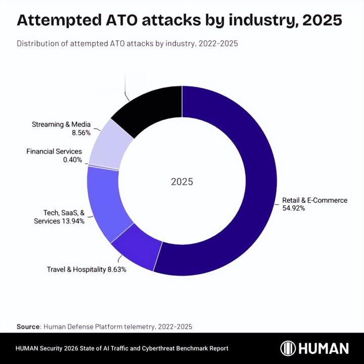 图丨2025 年各行业尝试账户接收 (ATO) 报复的百分比(起原:HUMAN Security)