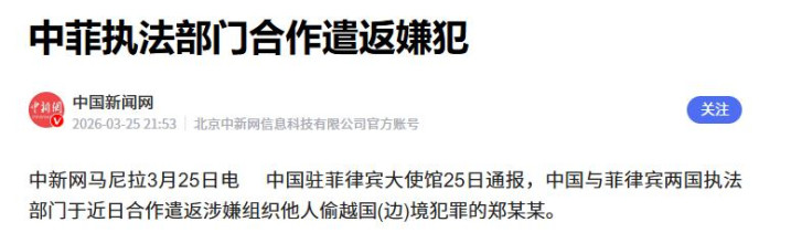 终末,菲律宾还主动跟我们联手搞起了打击监犯的合营。 就在3月25日,中国驻菲律宾大使馆发布了个大音书,说两边通力合营,成功遣返了别称涉嫌组织偷渡的嫌疑东谈主。