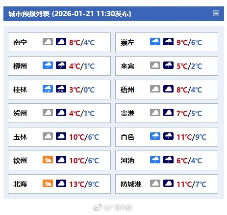 今天(21日)晚上到明天白天,桂林、柳州、河池、百色、崇左、南宁、来宾、贵港、贺州、防城港等市多云到阴天有分散小雨,其中高寒山区和桂北部分地区有冻雨、雨夹雪、雪、冰冻和道路结冰。桂东部分地区和沿海有5~6级、阵风7~8级偏北大风。最低气温:高寒山区-7℃~-1℃,桂北-1℃~4℃,桂中5℃~7℃,桂南7℃~11℃。